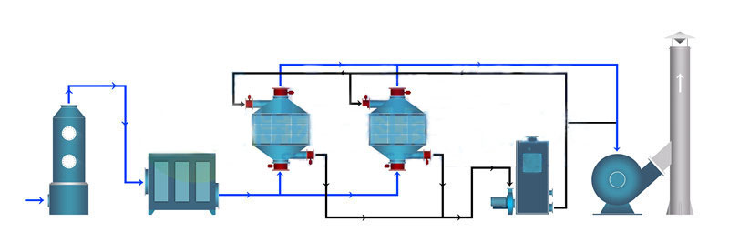 拟处理的喷漆废气考虑运营成本及安全性,本方案工艺路线拟定采用“催化燃烧+活性炭吸附脱附+风机”来进行有效的废气处理。工艺设备图如下: